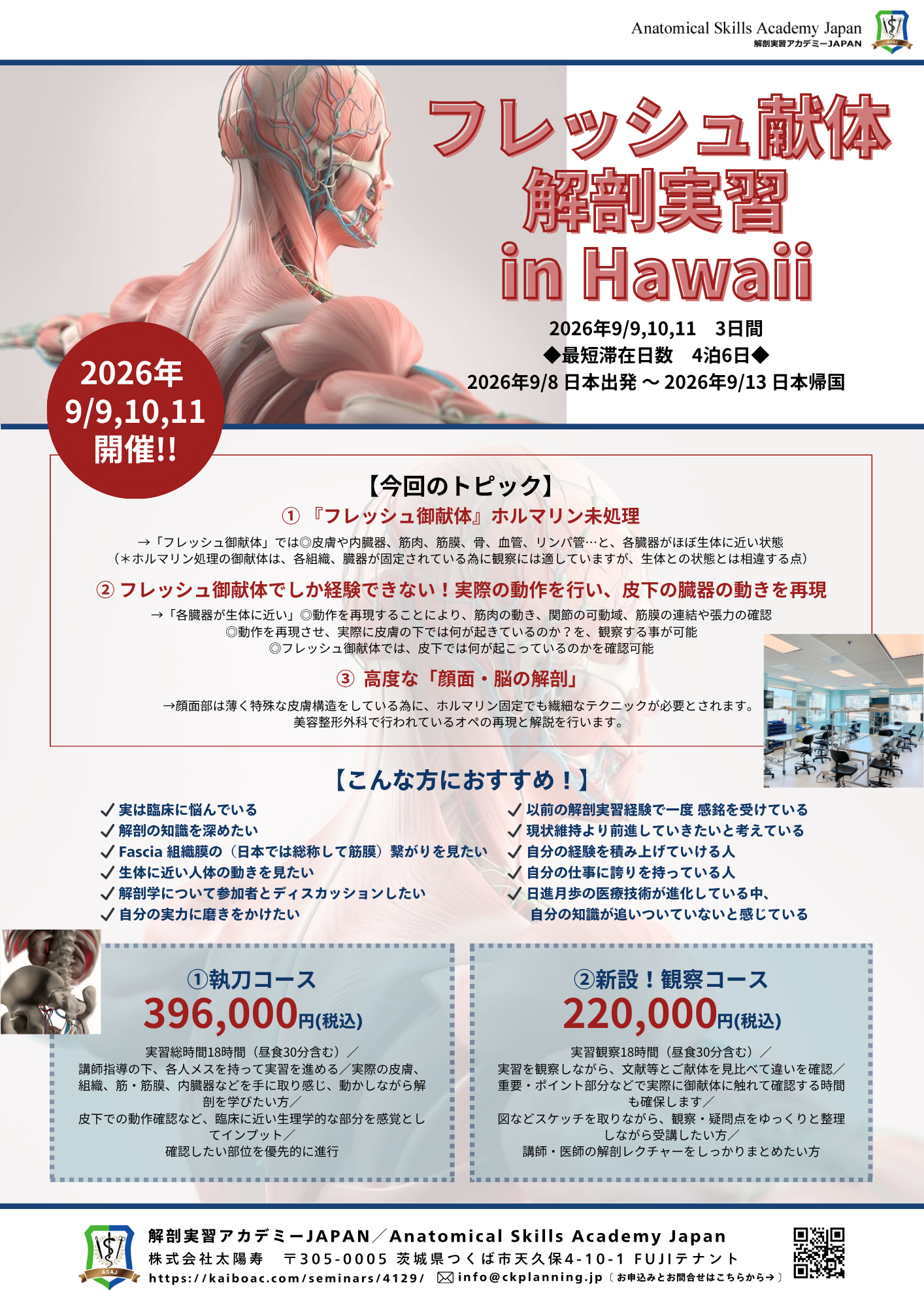 - 【2025年9/16,17,18 フレッシュ献体解剖実習 3日間開催】観察コースのみ残席4名(8/15更新)